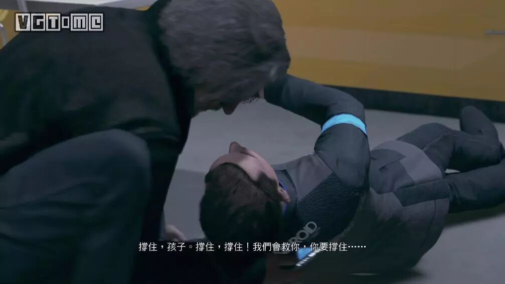 康纳在电视台调查时候如果选择去茶水间调查那三个临时工仿生人,戳穿之后仿生人会把他摁倒拔掉电池之后跑路(不得不让人吐槽RK800的战斗力,连个临时工都不如,啧啧),此时如果不采取行动把电池装回去,康纳就会在一分钟以内机能停止运转,此时如果什么都不做,快到停机时间的时候汉克会进来,看到康纳倒地时候的他的反应极为激烈(哪怕此时两人关系是敌对),并且喊了一句“son”,然后把康纳靠在自己腿上用手按住他的额头安慰他没事的。