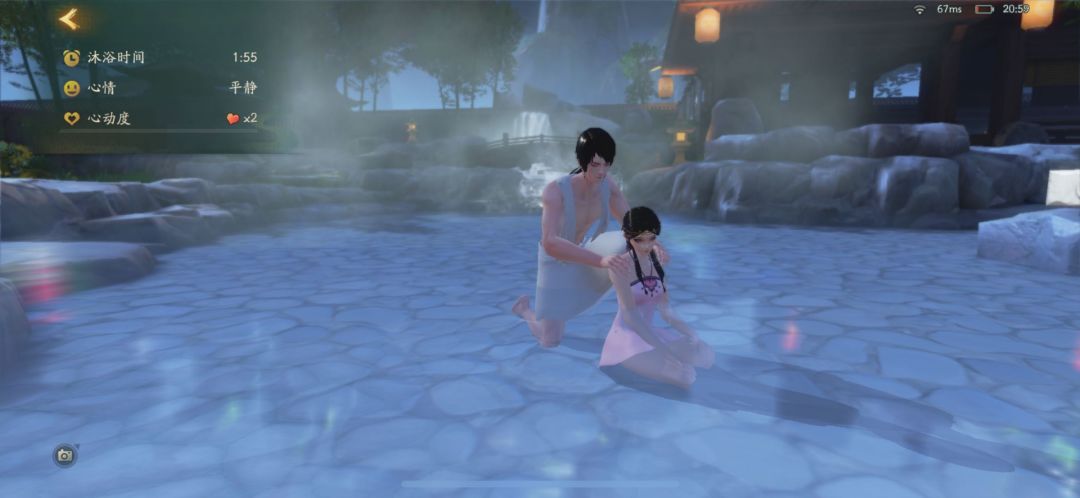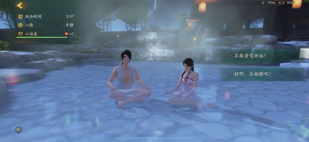 如果与妖物战斗感到疲累,玩家还可以在官方开放的”闲情雅趣“活动中选择与李淳风或者涂山小月等一起(加粗)沐浴。在有限的沐浴时间中,玩家可以与NPC进行交谈,之后你们的话题就会引入到”擦背“的问题上,相应地,心动度会有所增加。