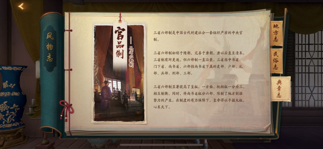 《神都夜行录》对于唐朝的考究还不止于此,从故事开始的杏花村到家园的设置地洛阳,剧情脉络一一展开。此外,沐浴文化、乐舞等大唐民俗除了作为游戏的玩法,还在“书斋”中分别设置了地方志、民俗志以及官吏制度等,以作为一个传统文化的“小科普”,可见开发者对传统文化继承与发扬的用心。
