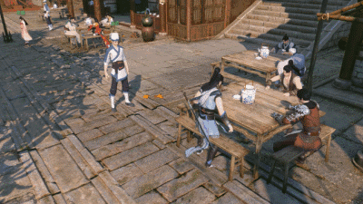 从随后公布的实际画面来看,游戏的细节确实有可圈可点之处。比如当玩家到店中坐下时,店小二会主动送上一壶茶: