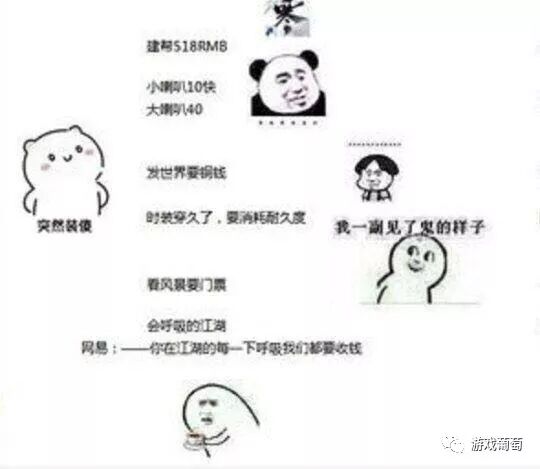 再比如“下雨天不打伞要扣血,雨伞一把100”、“时装坐骑有耐久,没耐久要去商城买”、“世界说话要钱,建帮派要518人民币,世界喇叭40元一次”“骑马时马会崴伤脚,当天不能骑,得重新买马”等等: