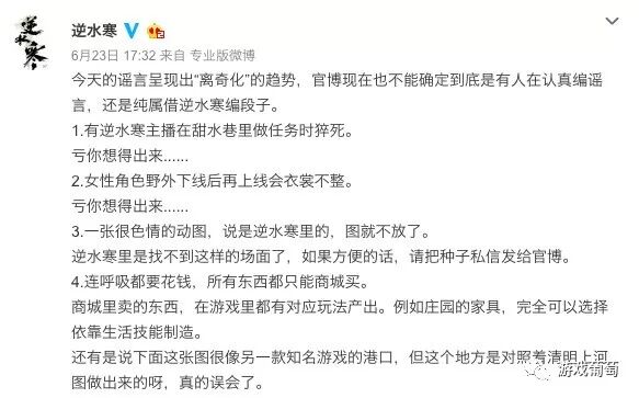 对于不少玩家而言,他们可能还没有玩过游戏,就已经被游戏有关的梗和表情包刷了屏。更有意思的是,这期间各式各样奇葩的谣言也随之接踵而至,以至于官博不得不出面辟谣,这一来一回的过程中,《逆水寒》的话题热度也被不断炒热。