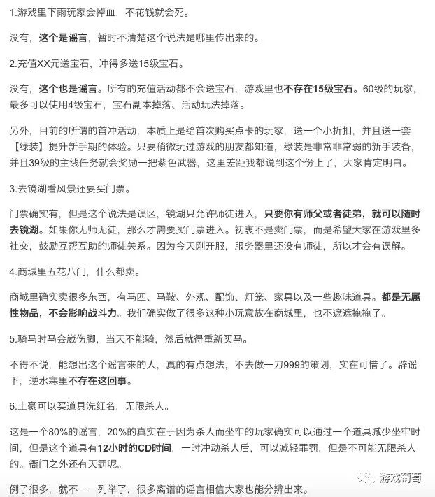 《逆水寒》官博的声明主要是针对流传比较广的谣言进行了回复。以“下雨掉血”为例,该说法源自于某直播平台,主播使用的职业技能有掉血机制,恰逢下雨天来临,导致玩家产生了误解。