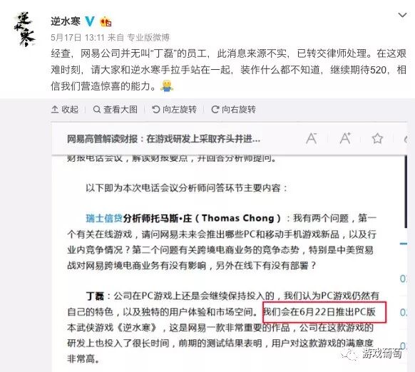 值得一提的是在520前夕网易发布财报后,由于丁磊透露了“我们会在6月22日推出PC版本武侠游戏《逆水寒》”的消息,官博甚至“怒怼”丁磊,称公司并无叫丁磊的员工,消息来源不实,已转交律师处理。尽管微博内容相当荒谬,但结合官博人设来看的话,这条微博也有很大程度的营销成分。如果就游戏开测曝光这个宣传点而言,《逆水寒》做到了其它游戏不曾想到的一面。