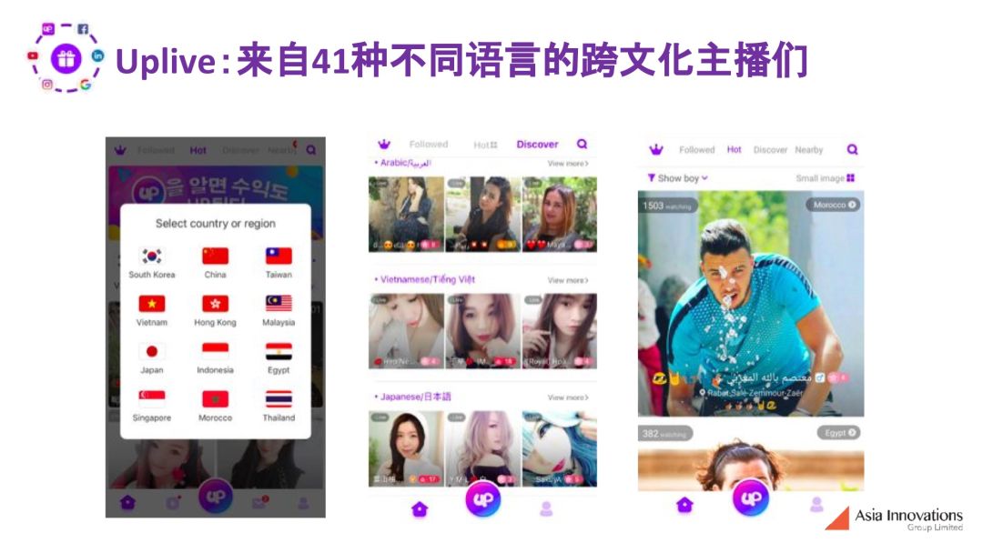 首先介绍一下Uplive里面有来自于41种不同语言的跨文化主播,从美国到摩洛哥都有。