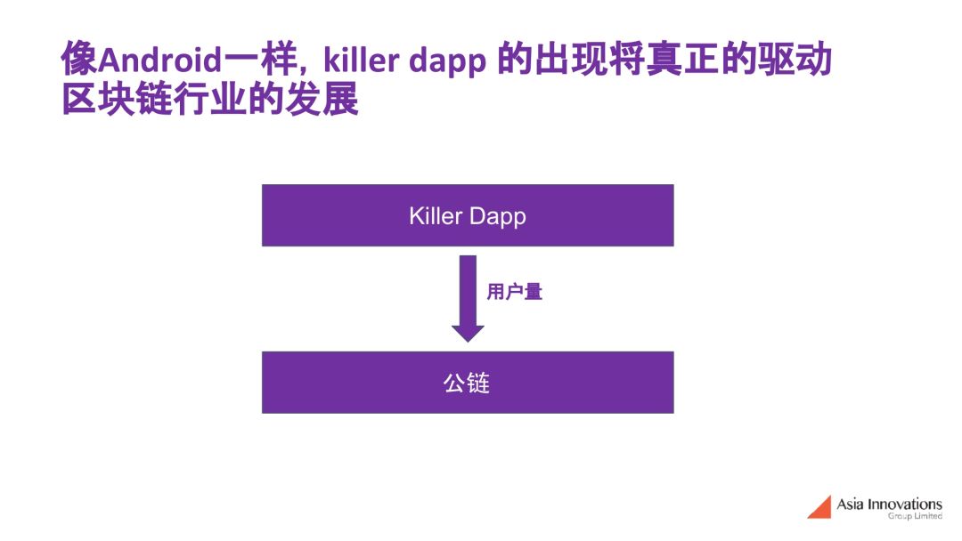 像Android一样,我们认为Killer Dapp的出现将真正的驱动整个区块链行业的发展,现在有无数的公链。现在公链一个是IOS,一个是Android。当年大概有七八条,我觉得未来也是一样的,这么多公链,其实最基础的公链不需要那么多。