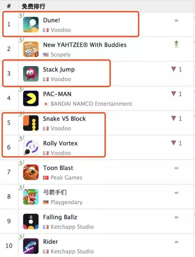 去年11月初美国iOS免费榜截图,前十名里有四个毒厂出品