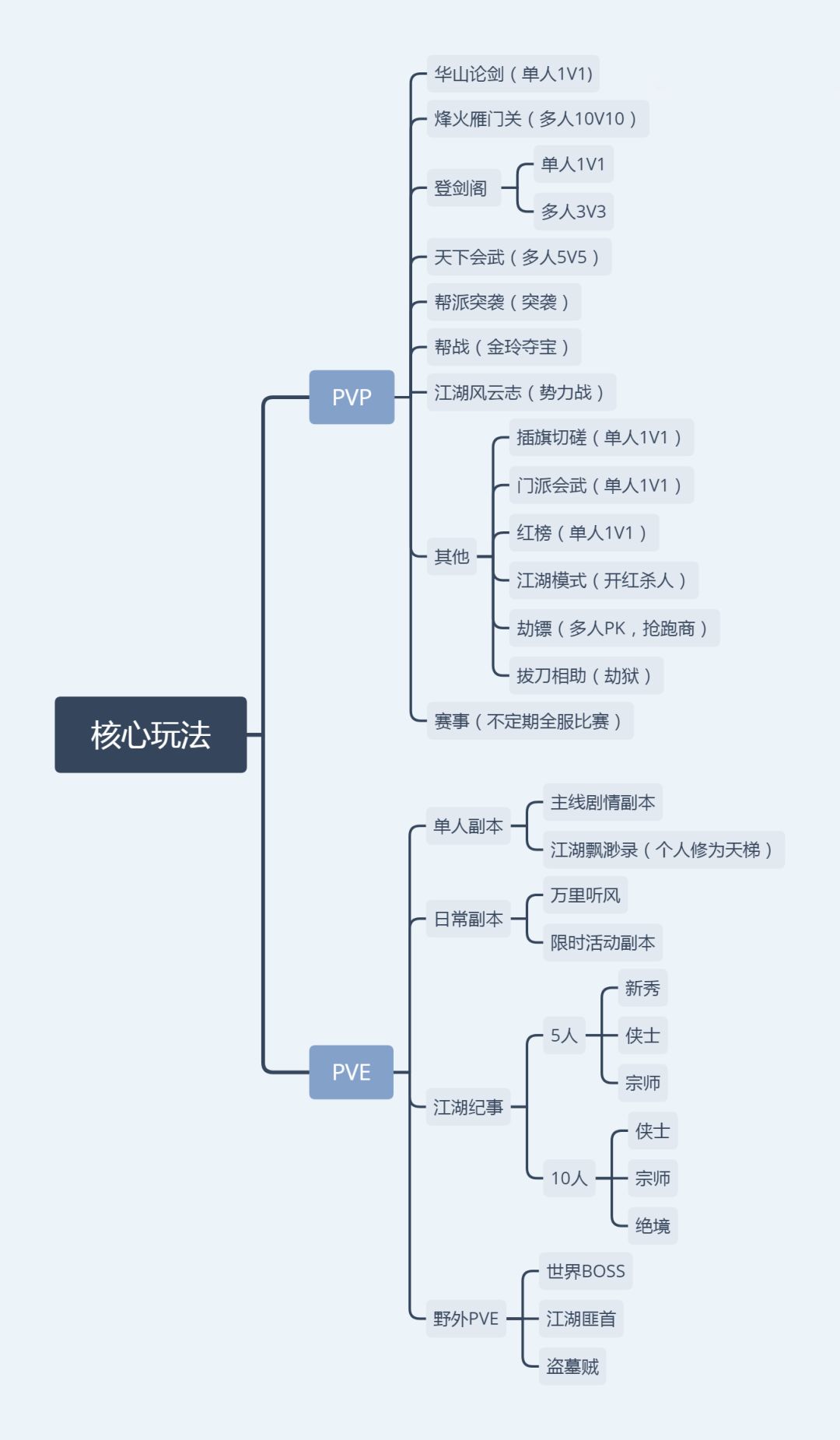 《楚留香手游》核心玩法为 RPG 即时战斗,作为一款 MMO 类手游,其系统可以按照游戏内直接展示出来的初步划分为以下几个大类,分别是:战斗系统、任务系统、养成系统、社交系统、货币与商业化和其他系统。每个大的系统下面又由不同的子系统或者子功能构成。