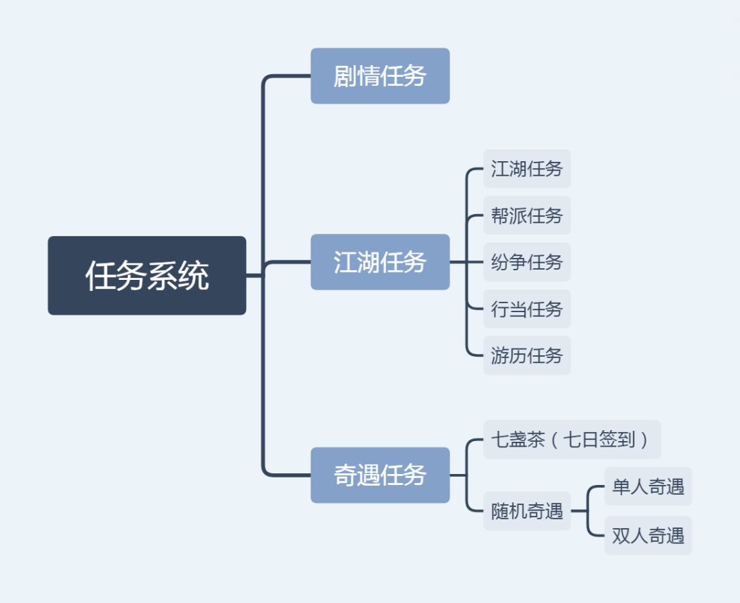 《楚留香手游》中的任务系统主要有三块,剧情任务、江湖任务和奇遇任务。剧情任务定位核心成长,江湖任务是属性成长,奇遇任务是个性追求。