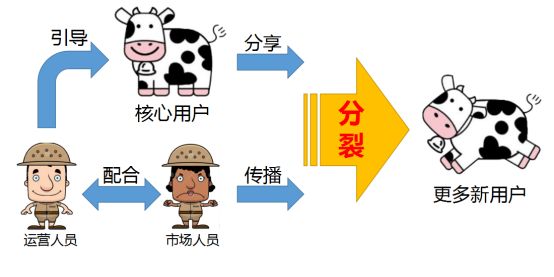 裂变过程其实就是一个如何通过线上及线下的各个渠道进行裂变从而产生更多新用户的过程,在这个过程中我们也可以理解成牧羊人(运营人员)引导牛羊(核心用户)去牧场外寻找伙伴并带回牧场的过程。而在这个过程中当你的付费达到一定利润后,你也可以雇佣精英猎人(市场人员)进行传播,从牧场外猎取更多的潜在用户。随后再让潜在用户回到拉新的过程。