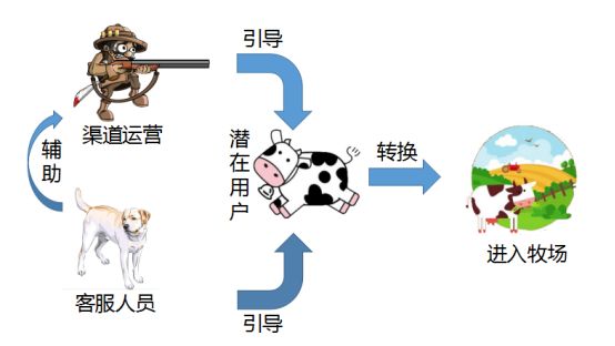 在“牧场理论”中如何将牧场外的牛羊圈进自己的牧场中,其实是很重要的步骤。一般从微博、微信营销层面来说无非就是派出精英猎人(应用/活动),辅助以猎犬(红人传播),大量的将牛羊(非品牌粉丝)赶入农场。其实对于游戏产品角度来说也是一样的,派出渠道运营(精英猎人),辅助以客服人员(猎犬),大量的将潜在用户群体(牛羊)赶入农场。