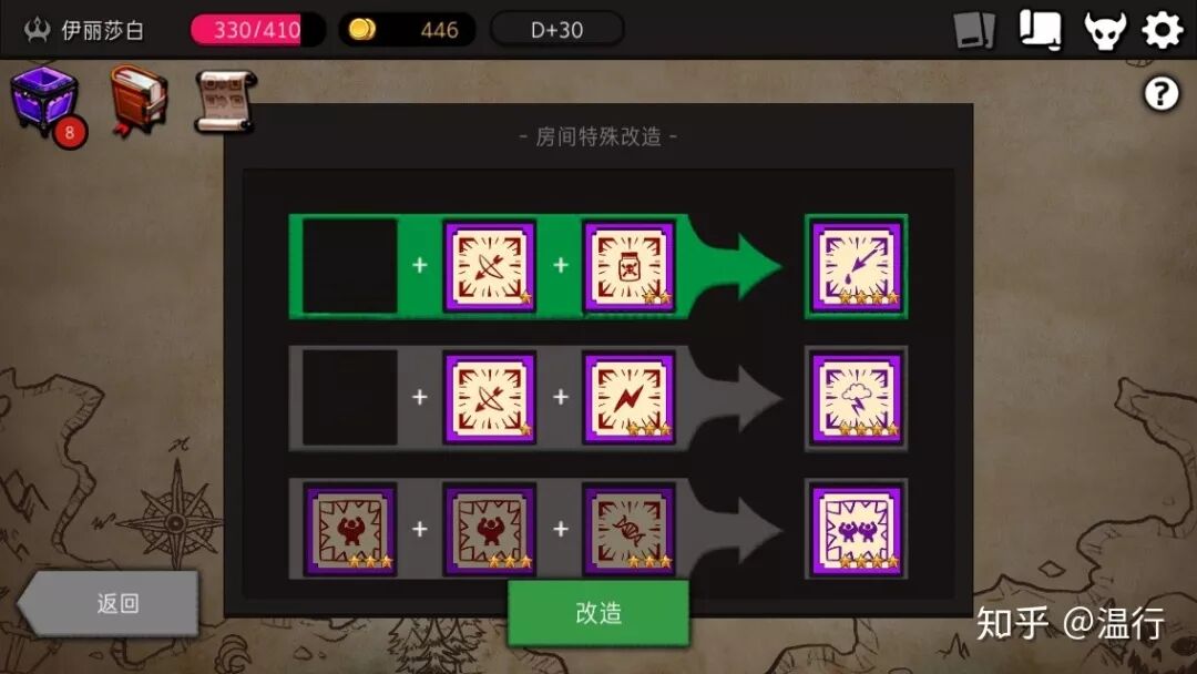 当获得一个新的房间时,如果将房间放置在一个已经放置房间的地方时就会出现切换和强化的选择(部分数值不可以简单做增量或减量的房间是没有强化收益的,如上图中陷阱:逆行,只能是1级)。