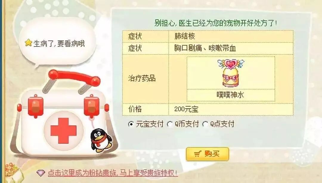 作为中国互联网用户接触到的最早一批国产虚拟宠物,QQ宠物是名副其实的“氪金”游戏。为了满足虚拟宠物突如其来的需求,玩家需要选择以元宝、Q币或Q点等方式完成支付。宠物饿了要付费,宠物脏了要付费,即便宠物死了,玩家也要购买“还魂丹”为宠物续命。