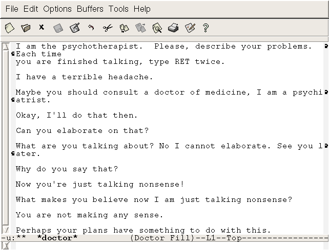 ELIZA的界面只是一个对话框,每当使用者输入一段文字信息,ELIZA都将运用模式匹配(pattern matching)技术作出自动应答,正是这一程序开启了延续至今的机器自动应答时代。