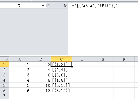 然后你试试在a1填1,b2填4,c1填="[{"&A1&","&B1&"}]"。试试就会变成如下结果。基本就不会错了。。。只要你在做框架的时候不要太浪太分心。