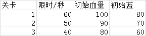然后定一下所谓的配置表。数据格式。来点简单的,例如一下关卡游戏可能会用下面一些参数.(这里主要就是程序看的了).记得跟他们说要读配置表。不然他们直接写死在代码里你就呵呵了。