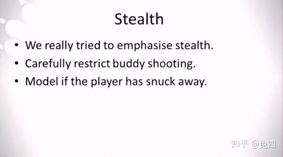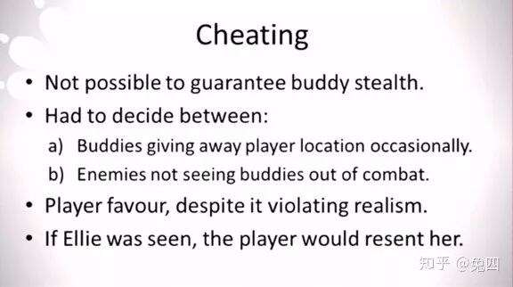 接下来我们要确保的一件事情是,艾丽永远不会打破己方的潜行状态。也就是当玩家控制乔尔开始潜行并接近敌人时,敌人永远只会是因为玩家被发现、玩家主动现身、玩家主动开枪射击而发现玩家,而永远不会当玩家还在潜行时就能发现艾丽。我们可以想想一下,当乔尔躲在箱子后好好的,艾丽却不小心把两人的位置暴露给敌人、或者无缘无故就开始拔枪射击敌人,这种体验非常不好,玩家对整个关卡的控制能力极大下降。