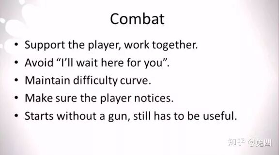 第三点是艾丽不能去影响关卡难度曲线。艾丽虽然能够在战斗中造成不小的影响,但玩家的关卡难度体验是位于同伴体验之上的游戏体验,难度体验曲线应该是位于更上层的东西,我们的关卡设计师早就已经平衡了关卡难度,我们不希望同伴AI的加入会影响这部分内容。