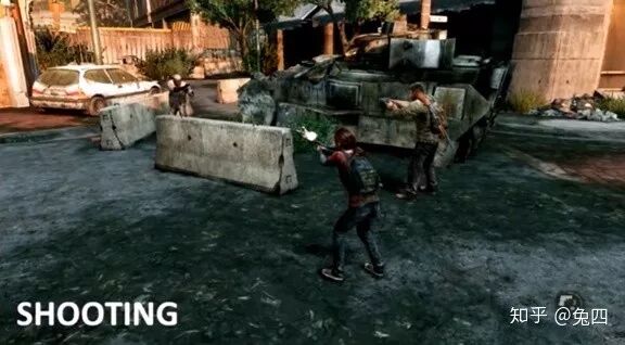 然后艾丽射击造成的伤害应该是相对真实的,比如一个乔尔要花3颗子弹就能杀死的敌人,艾丽总不能因为她是小孩子就要花20颗子弹才能射死对方。所以我们在思考这部分逻辑时,会从艾丽的射击伤害、射击精度、开枪频率这几个方面来进行考虑,目的就是希望艾丽能在战斗中帮助乔尔,并且能够在自身有危险的时候能通过开枪来规避危险,而同时又不会让玩家觉得艾丽的杀伤力太强。