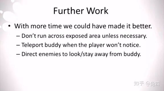 正如演讲一开始时所说,我们只有四五个月的时间来做这个同伴AI,所以我们其实有一大堆想做但是还未做的逻辑。比如说视野范围地图(exposure map),我们想捕捉到NPC们的视野范围,这样就可以让艾丽在切换掩体、移动时不会进入到对应的位置离里去。又比如说一种智能的瞬间传送,虽然之前我们说了我们不会在游戏中对艾丽进行瞬间转移,但在一些很开阔、空间很大的场景里,如果艾丽实在是距离乔尔太远,玩家有可能听不到艾丽的求救信号之类,所以我们还是希望做一些短距离的传送,只要这些传送不被玩家发现、不会惊吓到玩家就可以了。