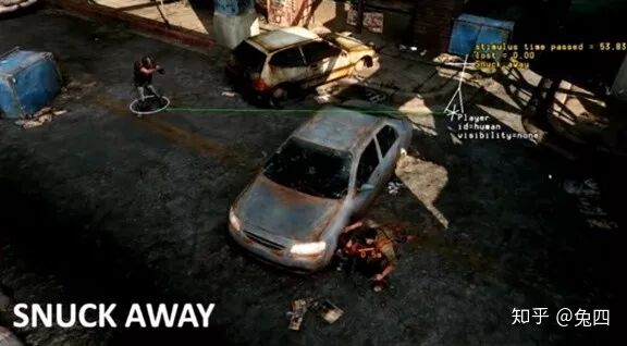 上图中左边是一个敌人,他面对的方向是他最后一次发现乔尔的位置,我们看到乔尔跟艾丽已经从那个位置逃脱并藏到掩体后,而且借助掩体已经移动到另一侧了,我们就会把这个过程称之为战斗中的潜行(snuck away)。这时候,如果艾丽还沿用我们战斗中协助乔尔的逻辑,艾丽就会主动站起来举枪射击敌人,进而暴露了乔尔的位置,使刚刚玩家所做的一切(潜行)白费了。所以在这种情况下,我们通过AI让艾丽去保持安静、不说话,当然也就不会开枪,相当于进入了我们上面说的潜行模式(stealth)。玩家此时就可以完全根据自己的想法和战斗思路去继续通关关卡。