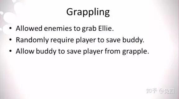 第二点就是我们要避免艾丽总是在等待乔尔,也就是说我们希望艾丽在战斗中不是一个完全被动的角色,而是自己会执行一些行动内容的角色。