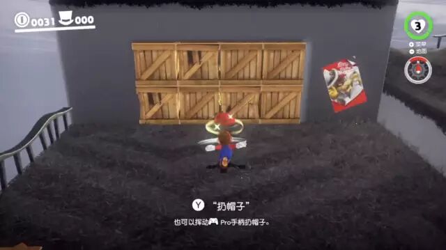 最后玩家来到第3区,第3区负责告诉引导玩家战斗系统和附身系统。来到第3区,玩家会遇到3只板栗怪,这里需要玩家使用帽子或者跳跃击杀怪物。当然如果玩家还没有熟练掌握攻击技巧也没有关系,门口就有可以恢复生命值的红心。到这里,玩家就已经掌握了“移动”、“跳跃”、“快跑”、“帽子的作用”、“隐藏房间”、“帽子攻击”、“跳跃踩死”、“被敌人触碰会掉血”、“吃红心会回血”等基础规则。而第3区房间内最后的一段内容就是告诉玩家帽子可以附身,附身可以获得不一样的特殊能力。