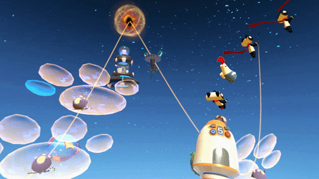 经历数次的原型迭代,原来的“飞机头”最终变成了“火箭”,游戏单人模式的核心玩法也确定了下来:玩家拿起手上的PS Move控制器,在“地球上空”前后左右挥舞,火箭“碰”到的小动物就会被“粘”住,“粘”得多了就会串成一串,就像“贪食蛇”。