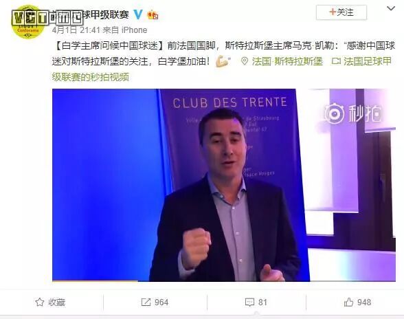在后半个赛季,法甲官微进行了不少次斯特拉斯堡的球队纪念品转发抽奖,斯特拉斯堡主席、法国足坛名宿马克·凯勒通过视频问候了球队在中国的关注者,并且直接用中文说出了“白学堡加油”。法甲联盟出了纪念品的钱,斯特拉斯堡出了人,这也是在二者的支持下才有了这样的活动。