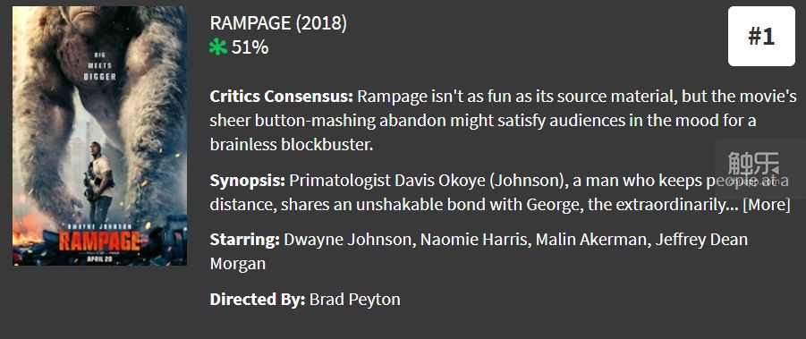 《狂暴巨兽》改编自1986年的同名街机游戏,目前电影的烂番茄新鲜度是51%