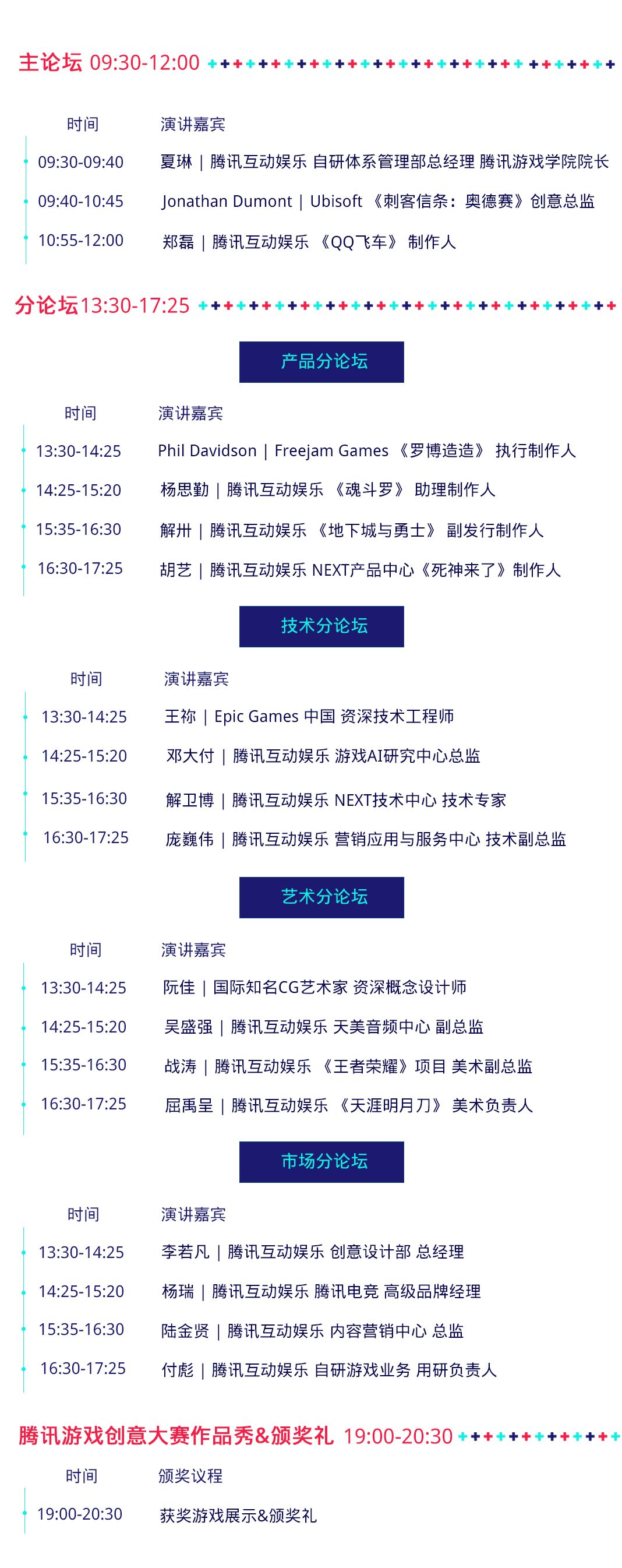 其中,《刺客信条:奥德赛》创意总监Jonathan Dumont、《罗博造造》执行制作人Phil Davidson、Epic Games中国资深技术工程师王祢、国际知名CG艺术家阮佳,将携手来自《QQ飞车》、《地下城与勇士》、《王者荣耀》、《天涯明月刀》等产品的数十位腾讯知名游戏制作人、技术/美术专家、市场大拿,在主论坛与分论坛上分享最新的游戏开发经验以及国际前沿资讯与技术,内容涵盖系统性的游戏策划与架构、引擎开发与AI探索、音效美术及世界观设计、品牌营销与市场宣发等多维度领域。