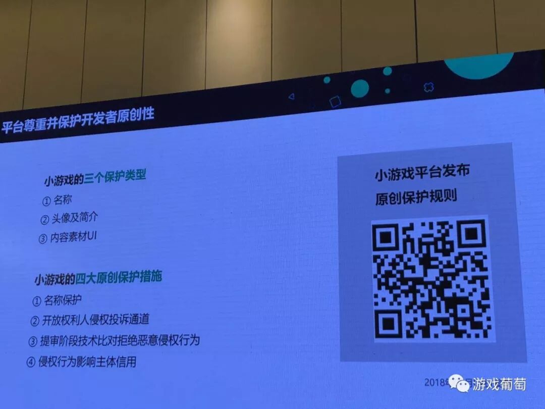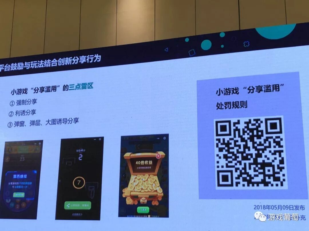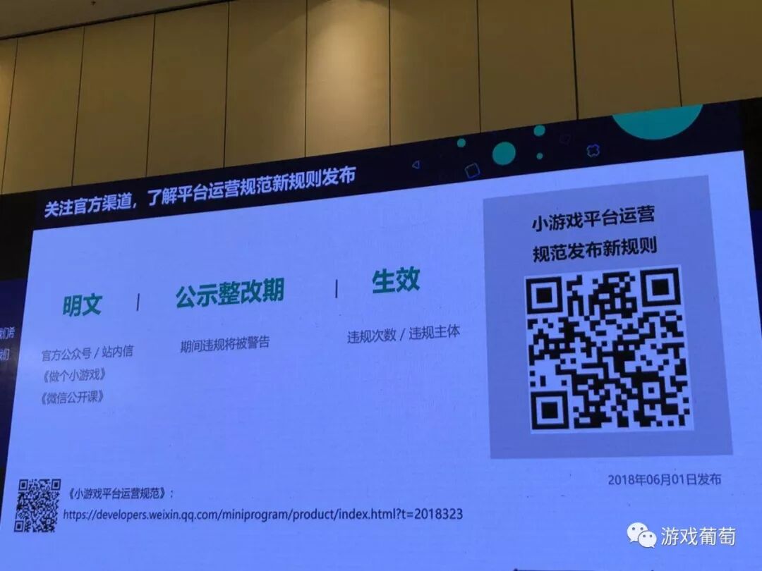 那我们发布到线上了,需要一些运营规范,那我的规范到底是什么,你的新规则,到底会在什么时候进行发布,为什么处罚我呢,针对这些问题,整个运营平台是公正,公开和公平的,我们希望把整个信息透明化,在6月1日我们发布了发布规范,大家可以扫描二维码看一下详细的信息,所有的运营规范可以在小游戏的运营规范上查看。