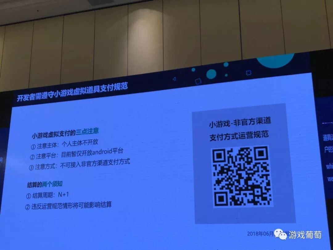 第三个小游戏虚拟支付的三点注意,我们会有一系列的虚拟道具支付规范,大家可以看MP平台的小游戏的虚拟支付规范。请大家注意三点:主体,平台和支付方式。那支付之后,安卓的结算周期是N+1,次月结算的,还有希望大家共同的维护生态,有一个点是需要大家注意的,比如是在支付上有一些违规,在结算的周期上是会有影响的,这也是和大家的商业收益是有关联的。