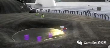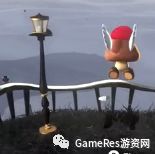 图1.3是玩家从A区域抵达B区域的入口,地图的主色调是灰白,而地图中吸引玩家的元素由:绿油油的青蛙以及一滩池水。当玩家抵达池水处时,会发现池水中有3个紫色的金币,玩家领取金币时会发现自己的货币数得到增加。这中间不仅让玩家熟悉国家货币是什么形状,也会潜意识让玩家明白国家货币是一种隐藏货币,需要玩家自己探索获得。而绿油油的青蛙则是当玩家挥帽子攻击它时,玩家会附身在青蛙身上。附身在青蛙身上后,玩家可以跳的更高,这又教会了玩家其它生物都可以附身的技能。