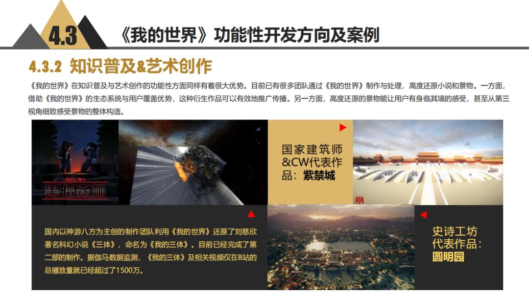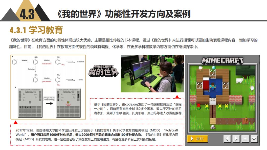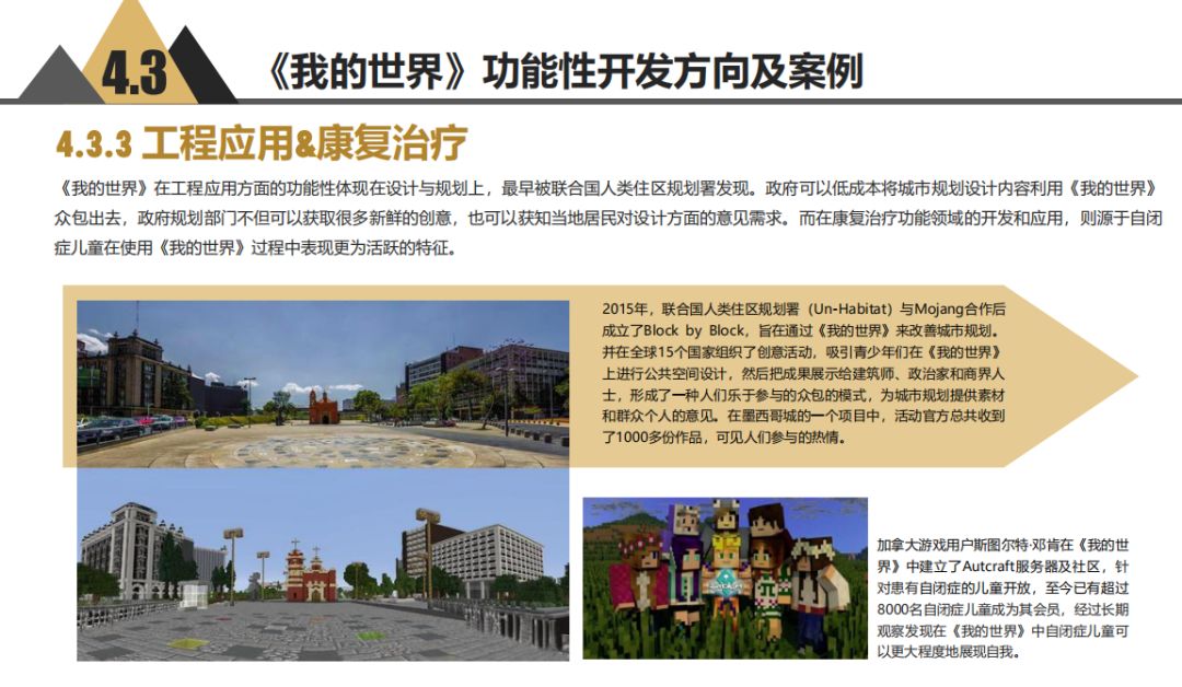 在伽马数据发布的《功能游戏报告》中,《我的世界》的功能性应用方向被划分为“学习教育、知识普及、艺术创作、工程应用、康复治疗”等几大方向,目前,在国内外,《我的世界》功能性开发案例都有很多,这也为其今后探索更广阔的功能性用用领域确定了方向。