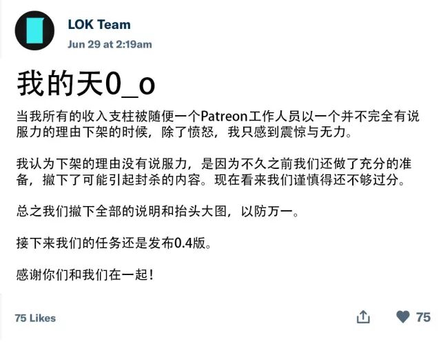 然而创作者们也都明白,在Patreon背后提供支付便利性的第三方支付平台,一直对于成人内容都持着保留态度。即使是最乐观的T大,也明白Patreon不得不经常向支付平台妥协。一旦支付平台出于社会风气或者法律法规的原因向Patreon施压,类似本次的事件很可能再度发生。