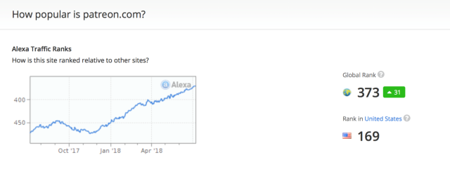 Patreon在大本营美国的Alexa排名是169,已经成为众筹网站的中坚力量
