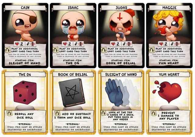 游戏卡组中包含4个起始角色,分别是该隐、以撒、犹大和抹大拉,并已通过众筹目标的达成陆续解锁了参孙、夏娃等新角色。此外,卡组中还包含了100张基本牌、100张宝物牌和100张怪物牌,以及100个用来标示玩家持有金币数目的代币。这其中,有玩家耳熟能详的各种旧有物品和怪物,也有针对《四个魂》设计出来的新面孔。