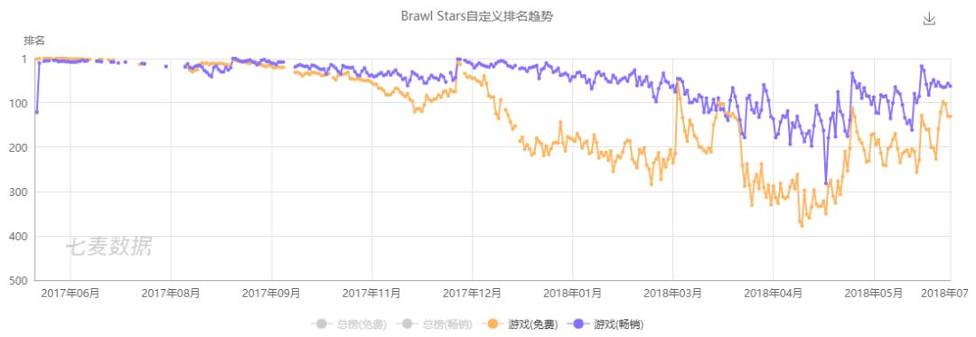 以最先测试的加拿大区为例,除上线首月外,《Brawl Stars》的表现起伏较大,其中以游戏免费榜的曲线最为明显。特别是在2017年12月的二代版本上线后,相关数据不升反降,玩家对于Supercell这种推倒重做的方式明显有所抵触。