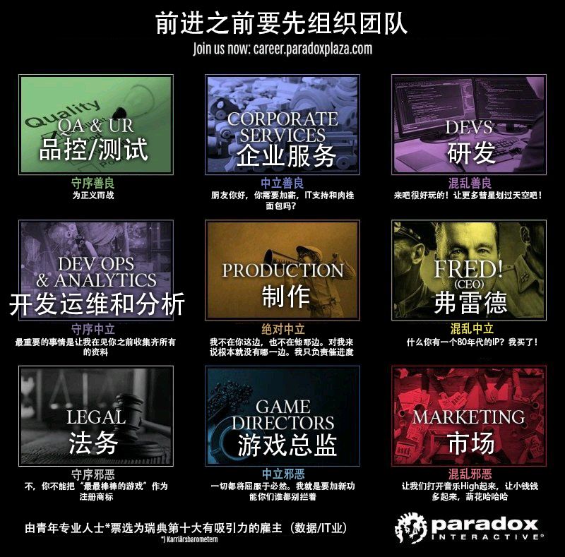 在P社发展壮大以后,韦斯特还贴心地给想要入职P社的年轻人,提供了一张龙与地下城九宫格阵营样式的导图: