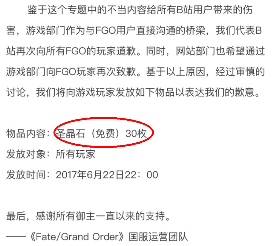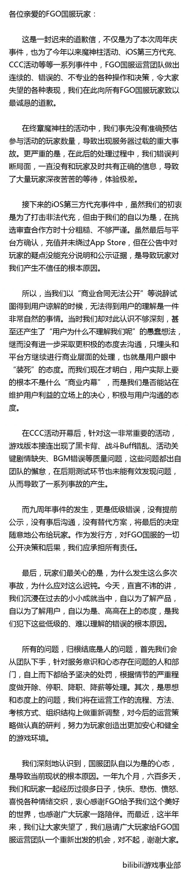 终于,在7月4日晚,FGO官博发出了正式道歉声明。在这封道歉信中,运营方细数了自己从年初到现在的骚操作,玩家所有不满的地方基本都提到了。B站将这一系列错误的原因归结为自己因为小小的成果而过于膨胀,并保证整改、追责,相关责任人将会受到降薪、辞退等处罚。