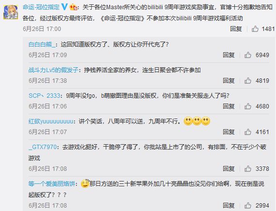 B站代理的所有游戏,乃至B站渠道上架的大部分游戏都得到了9周年福利。只有为B站带来了近60%收入的FGO不参加此次活动。B站运营方在并不正式的通告中将锅统统甩给日本版权方,只一句“经版权方审核,FGO不参加活动”后便再无回应。