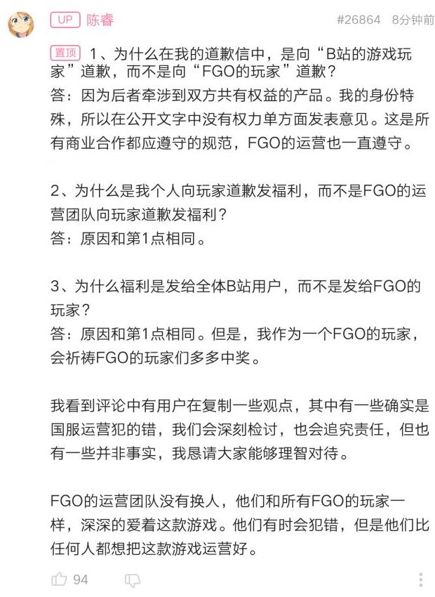当然,陈睿自己也在评论区里回应了一部分玩家的质疑,不能说FGO的原因是因为版权共有,自己没权利代表FGO。面向全站抽奖原因同上,只能祝FGO玩家多多中奖。不过这样的解释,在早已对B站失去信任的玩家看来可谓相当苍白。