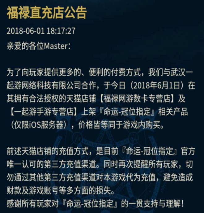 6月19日,官博发出公告,宣布终止代充服务合作。承认官方代充店之前存在未经许可的代充行为,并表示会将合作相关事宜和事件经过正式告知日本版权方。