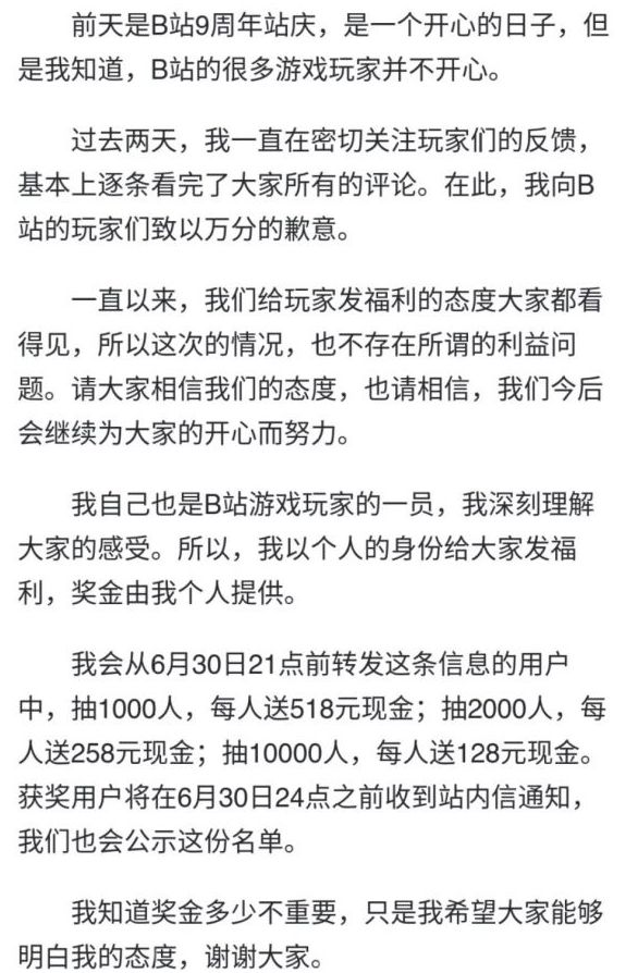 或许是为了平息玩家的愤怒,又或许是为了不让捕风捉影的猜测和流言进一步扩大。6月28日,B站董事长陈睿终于出面。他用个人的B站账号发了一条状态,向很多“不开心的玩家”道歉,陈睿表示自己也是游戏玩家,能够感同身受。最后,以个人名义抽取13000人,送出不等的现金。奖金总额高达230多万元。