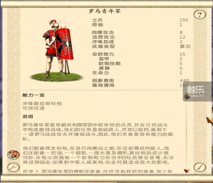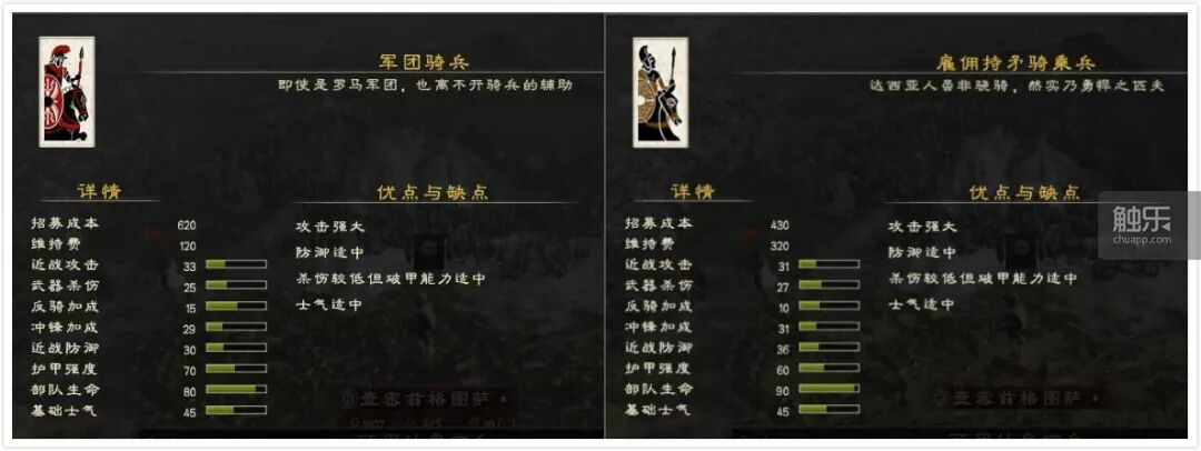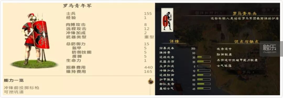 《罗马》作为完善“全战”框架的革新之作,“兵将”分离,彻底将兵种属性独立了出来。《罗马》的兵种属性主要分6部分:数量、经验、攻击、防御、费用以及特性,再加上隐藏的士气属性。