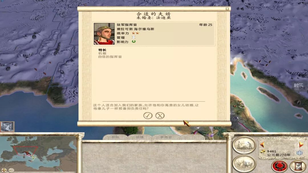 除了完整的属性体系,《罗马》还加入了家族树系统。家族树的出现很有必要,因为在《罗马》和《中世纪2》(2006)原版里,玩家是不能主动招募将领的,获得新将领的方式只有儿子成年、女婿入赘和收养(包括提拔以及收买)3种,前两种方式都是围绕家族树展开的。