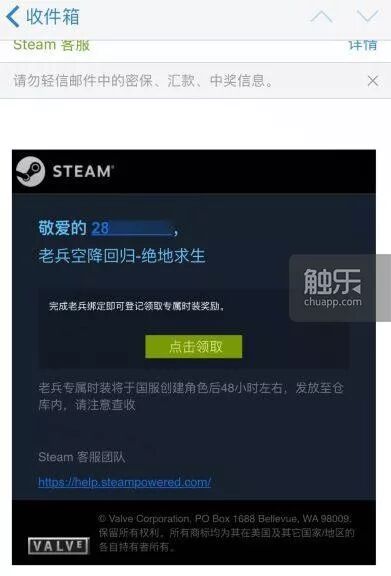 目前这类骗术仍旧存在,最常见的钓鱼链接主打“《绝地求生》老兵回归”——在腾讯官方出了“老兵回归”活动之后,这种钓鱼邮件层出不穷。其原理也是一样的,盗号者群发钓鱼邮件到QQ邮箱,诱骗用户输入Steam的账号和密码,甚至顺便还能把QQ号一并盗走。