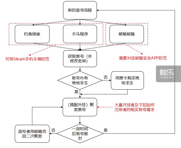 不难看出,这条产业链不同于一般有头有尾的流程图,而是一种循环:只要黑号的市场需求持续存在,玩家又没有足够的账号保护意识,这个产业链就会永远地循环下去。由于Steam不受我国法律保护,盗号者也很难被追究法律责任,所以这条巨大的黑色产业链仍然会长时间地存活下去。