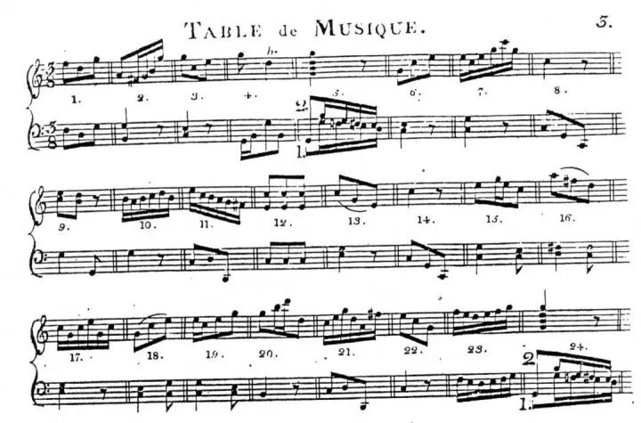 虽然掷骰子演奏音乐并不是莫扎特最早发明的,但他写了一首随机系统相当复杂的华尔兹,总共有188个1小节(3/8拍)长的碎片。在演奏之前先掷16次骰子,上下乐句各8次,每次掷两个,根据两个骰子点数之和来从188个音乐碎片中选取相应的编号组成乐句: